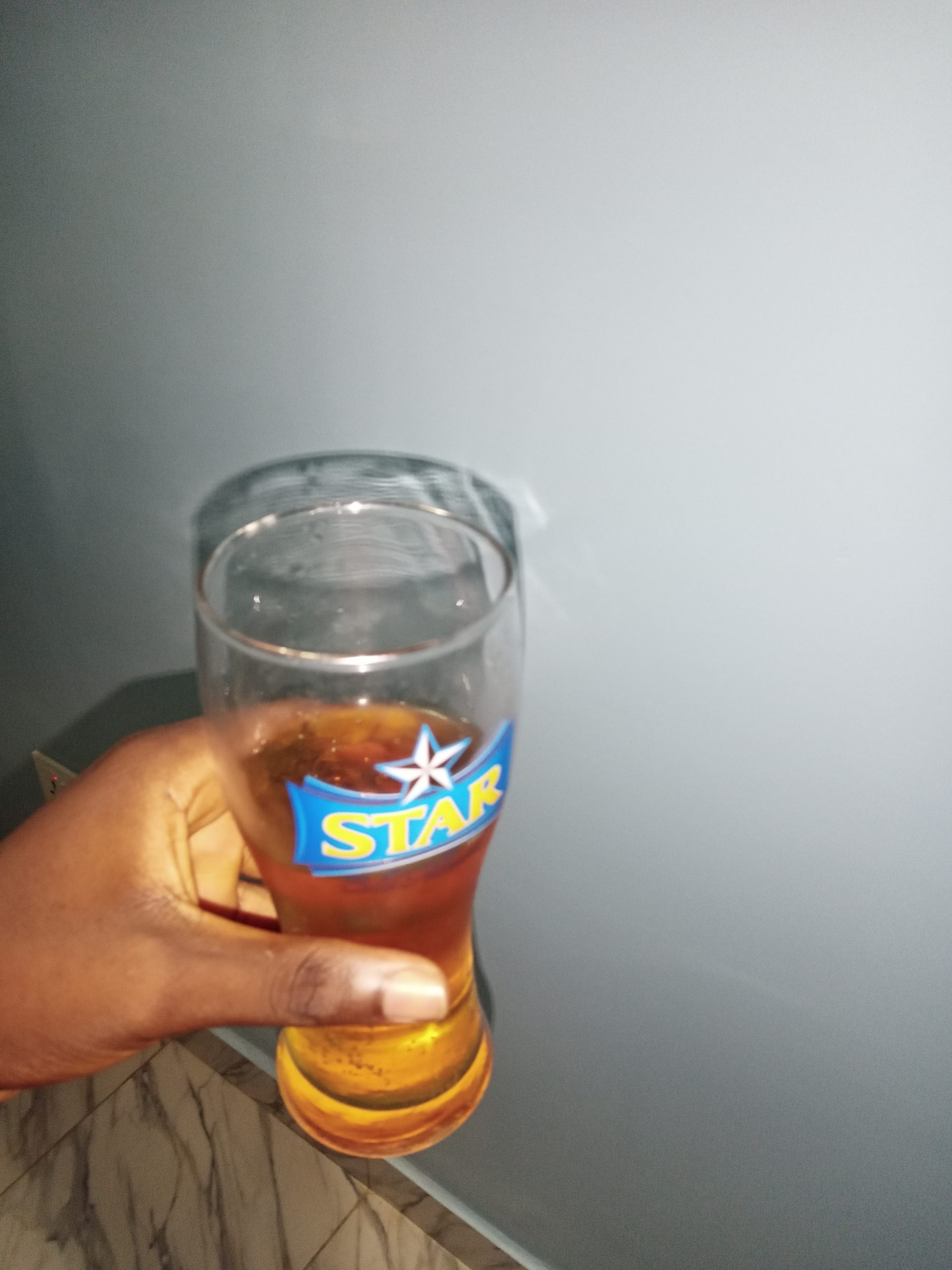 The picture attached to this image is a glass with STAR (Lager beer) inscribed on it. The content is a non-alcoholic energy drink. See how easy it is to quickly conclude that whoever holds it is drinking beer?