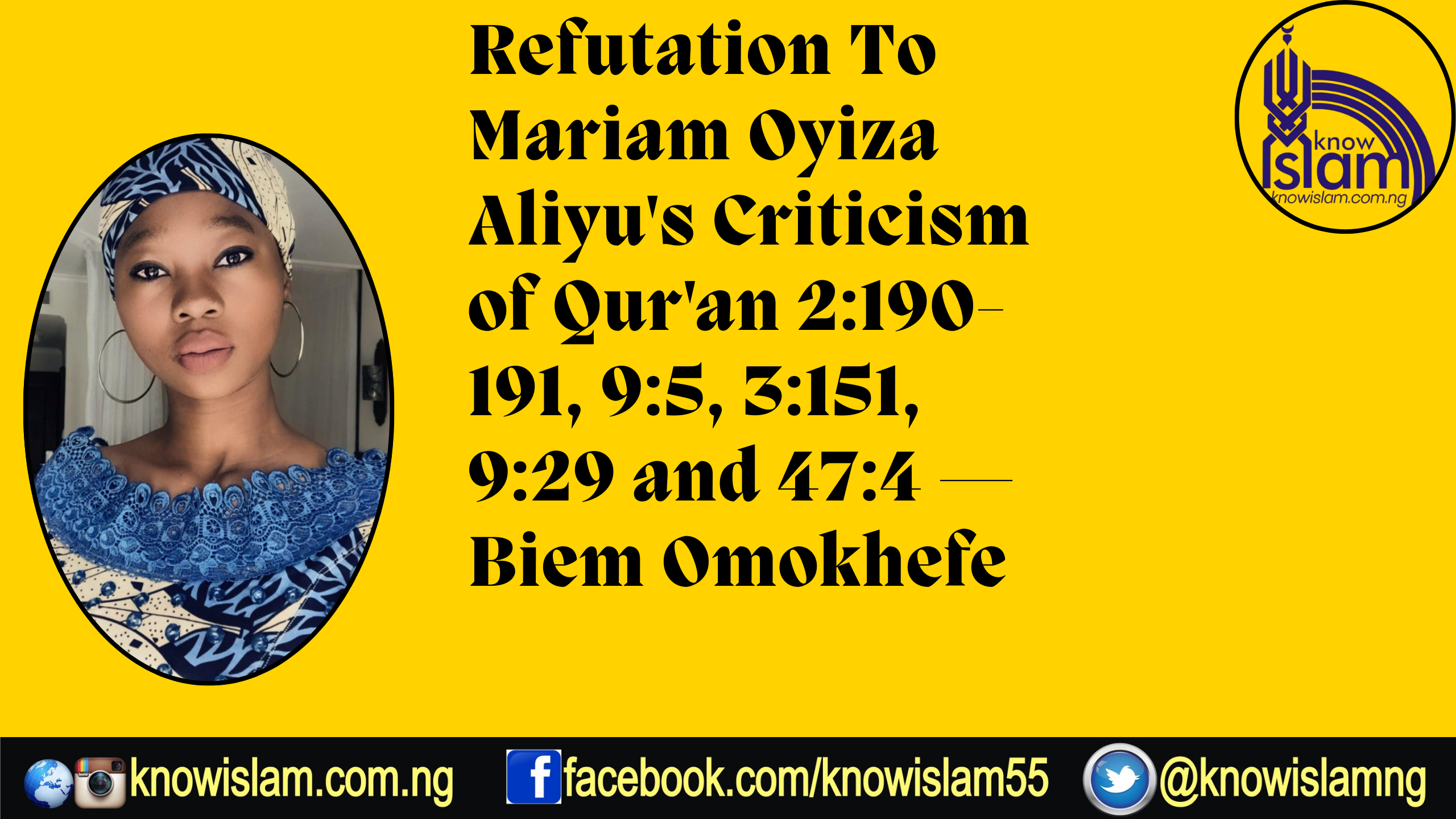Refutation To Mariam Oyiza Aliyu’s Criticism of Qur’an 2:190-191, 9:5, 3:151, 9:29 and 47:4 — Biem Omokhefe